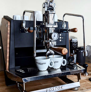 For Vostok-versioner med tilpasset træ: Træsorten på det valgte portafilterhåndtag ændres, og tamperen kommer med en stålfod og et aluminiumhåndtag fra ACS.