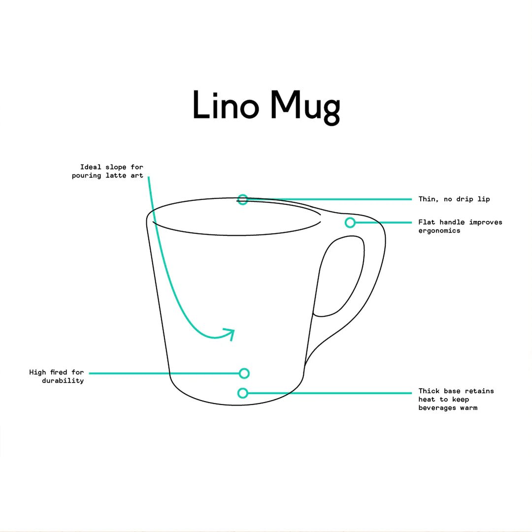 - Tilgængelige versioner i Lino-serien: Espressokop 9 cl, cappuccinokop 18 cl, latte-kopper 24 cl og 36 cl, kaffekop 30 cl, pulled-tallerkener, mælkekande og farverige mugger
