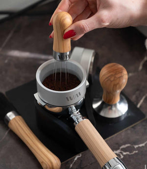 Håndlavede og omhyggeligt udvalgte træsorter komplementerer visuelt metalkomponenterne og giver en unik haptisk fornemmelse.