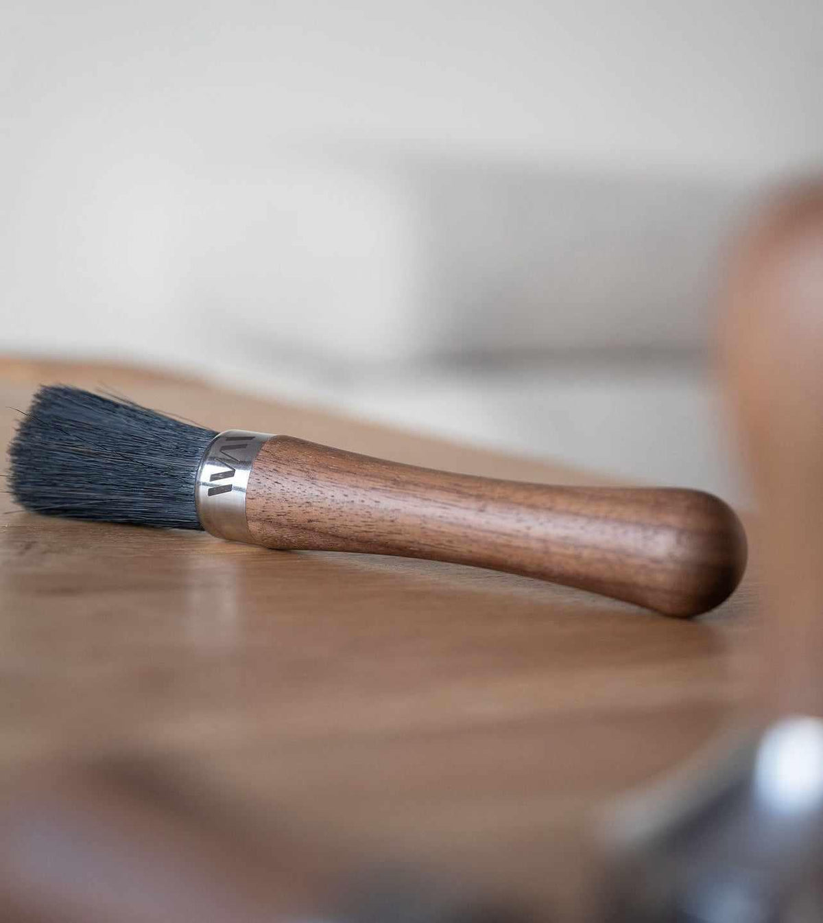 En graveret rustfri stålkant sidder sømløst på det polerede træhåndtag og omslutter beskyttende børstehår.