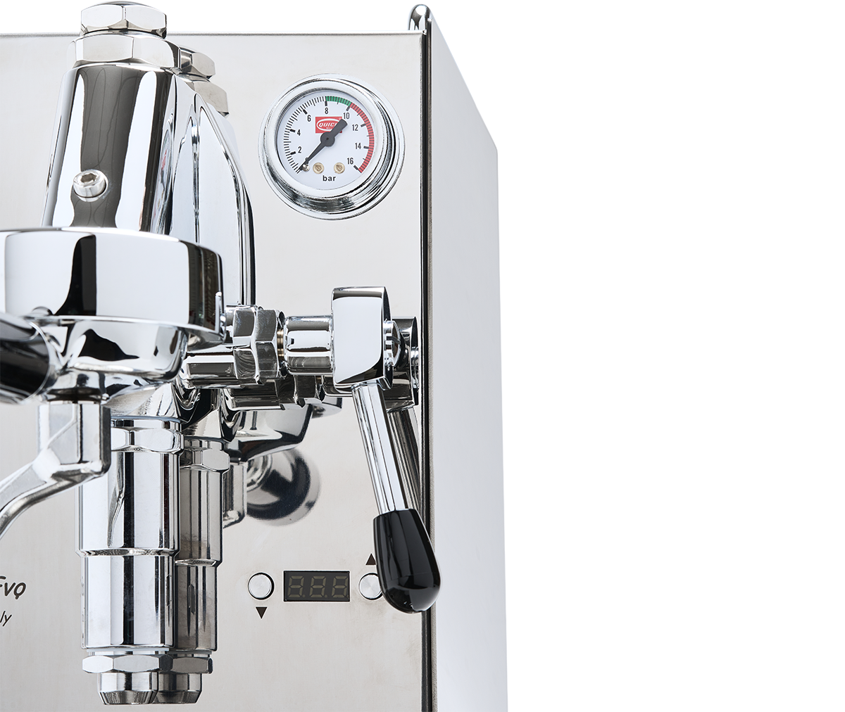Det integrerede display viser temperatur, shottimer, vandstand og indstillinger. Trykmåler (0–16 bar) og klassiske spakregulatorer gør betjeningen intuitiv og præcis.