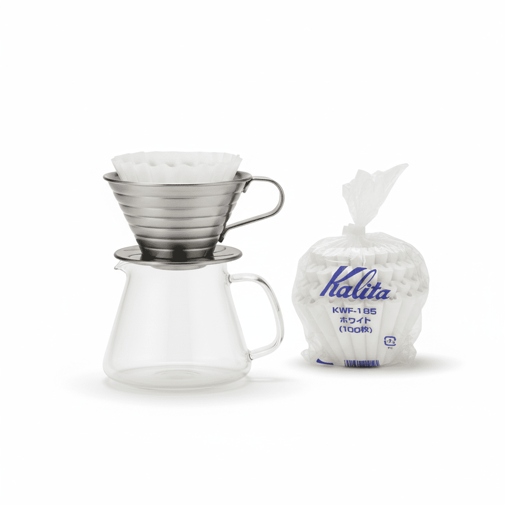 - Filterpapir (100 stk.) – Naturligt blegede filterpapir til Kalita 185-serien, optimeret til en ren og afbalanceret kop kaffe. Perfekt til 2–4 kopper.