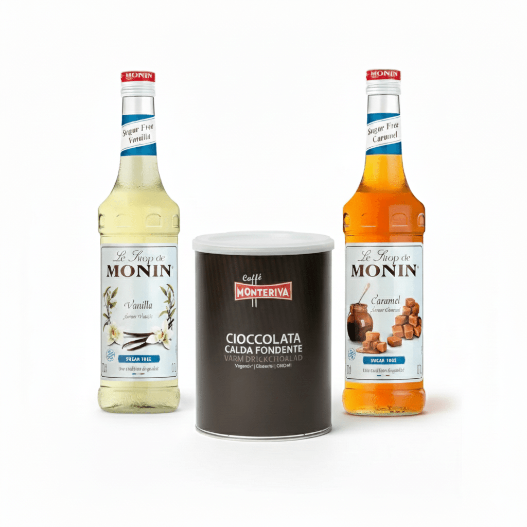 Santa's Sweet Trio kombinerer alt, hvad du behøver for at skabe luksuriøse varme drikke derhjemme. Denne pakke indeholder tre premiumprodukter, som sammen giver dig uendelige muligheder for at nyde italiensk varm chokolade, smagsatte kaffe og kreative mokka-varianter.